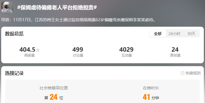 而上述事件相关话题#保姆虐待偏瘫老人平台拒绝担责#和#保姆虐待辱骂偏瘫老人称死了活该#均登上微博热搜,分别最高占据社会榜的第24位和热搜榜的第38位,阅读量分别达404.5万和556.4万。